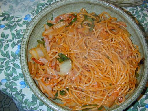 味付け。麺を加えて、ケチャップとソース(隠し味程度)を投入。全体が真っ赤になったら、出来上がり。
